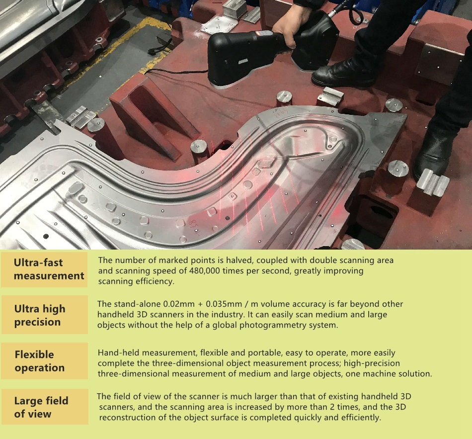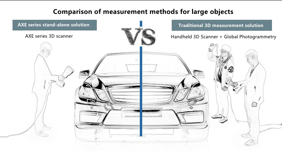 AXE 3D scanner is another global innovative handheld 3D scanner. In addition to all the features and functions of other hand-held laser 3D scanners, the AXE series' breakthrough is to subvert the way of measuring medium and large objects. AXE can complete high-precision scanning of medium and large objects without using any equipment. The volume accuracy of a single machine is far better than other handheld 3D scanners, and the double scanning area greatly increases the 3D scanning speed.