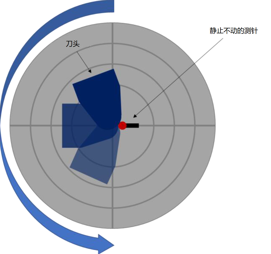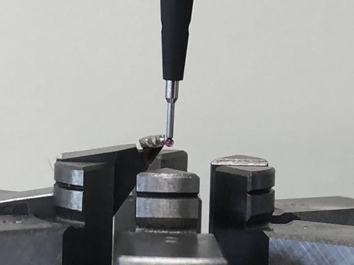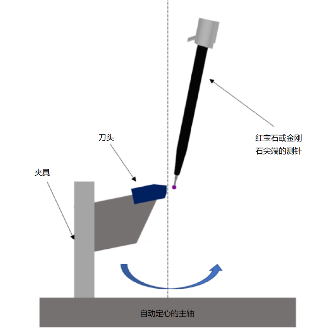 測(cè)量時(shí)刀頭須向上傾斜裝夾,使刀頭的圓柱形切削面平行于圓度儀立柱(如圖1和2所示)。切削面的圓柱中心名義上對(duì)齊主軸中心,并使用部分圓度測(cè)量的自動(dòng)程序精確調(diào)整零件中心,使其相對(duì)于主軸的偏心小于0.3μm。
