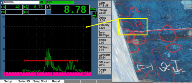 在這種情況下,可以使用EPOCH 650探傷儀和DL4R-6X20(4MHz)雙晶探頭對金屬材料進行腐蝕檢測。這種儀器可以在屏幕上顯示超聲回波頻譜。根據(jù)波形、衰減和相位偏移情況,經(jīng)驗豐富的NDT驗船師可以推斷出有關板材或結構的大量信息。驗船師還必須區(qū)分真正的回波、虛假反射和衍射等信號。