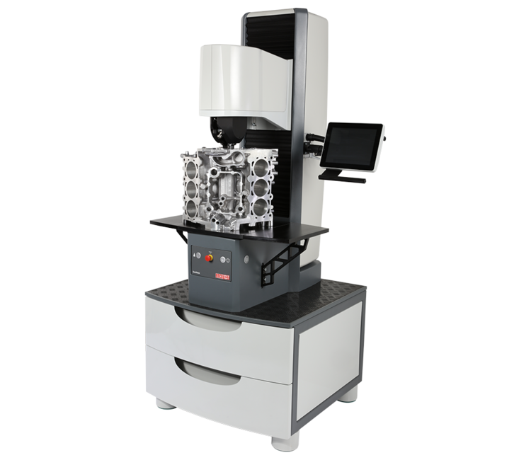 DuraScan基于獲得的V型概念進行了緊密和不對稱的設計,采用了電動測頭和垂直方向上固定的載物臺。測頭在y-軸和z-軸方向可移動,而載物臺則在x-軸方向可移動。