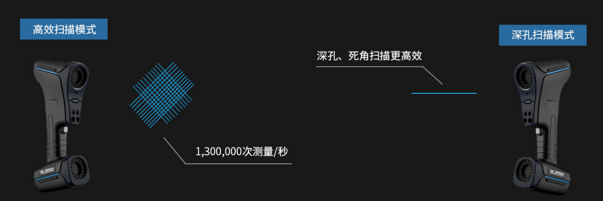 雙模掃描模式 支持高效掃描和深孔掃描兩種模式,針對深孔和死角部位,可快速切換成1束激光線,實現三維測量。 |