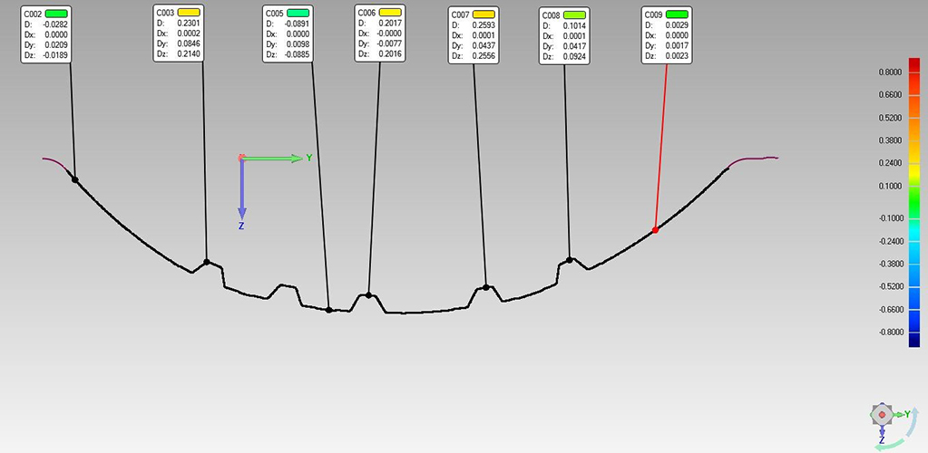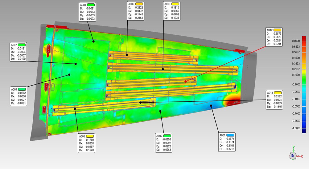 針對機翼飛行后出現的形變問題,先使用全局攝像測量系統,獲取機翼的空間定位點,再搭配手持式激光三維掃描儀進行三維數據的獲取,掃描的三維數據與機翼的數模進行3D比較,計算出飛行后發現的形變量以及關鍵部位的尺寸,確保下次飛行安全。