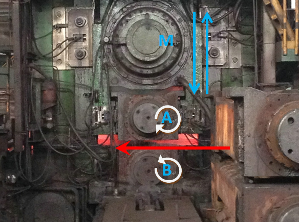 鋼錠沿紅色箭頭所示方向通過軋機,與此同時,軸承M提供并控制下壓力量,軋輥A和軋輥B配合旋轉,將通過的鋼錠軋制成為所需的鋼板形狀。整個軋制過程需要經過八組軋輥,軋制由粗到細,后面成為合格的鋼板產品。