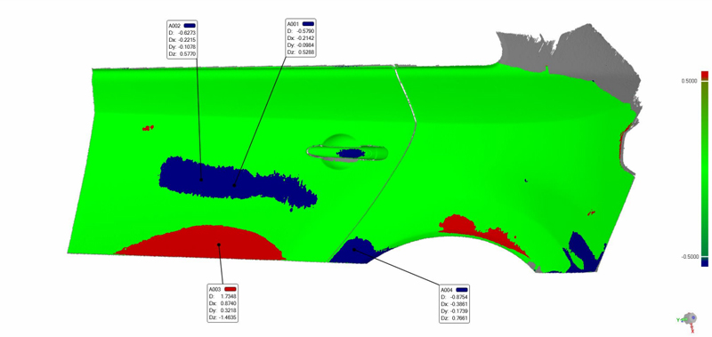 解決方案:HSCAN手持式三維掃描儀。通過手持式三維掃描儀對故障車的撞擊部位車身進行激光掃描,獲取車身的三維數據,與同類車型的正常車身三維數據進行比對,得到撞擊車身的偏差值。