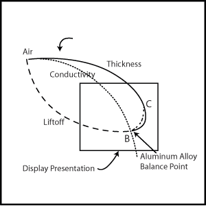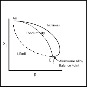 圖1顯示的是一個典型的阻抗平面圖,圖中的坐標軸分別為電感抗(XL)和電阻(R)。當探頭處于空中時,點位于電導率曲線的頂部,隨著材料電導率的增加,這個點會沿著曲線向下移動,點B的位置為待測鋁合金的平衡點。 從點B位置開始,隨著材料厚度的縮減,點會沿著厚度曲線向上移動。